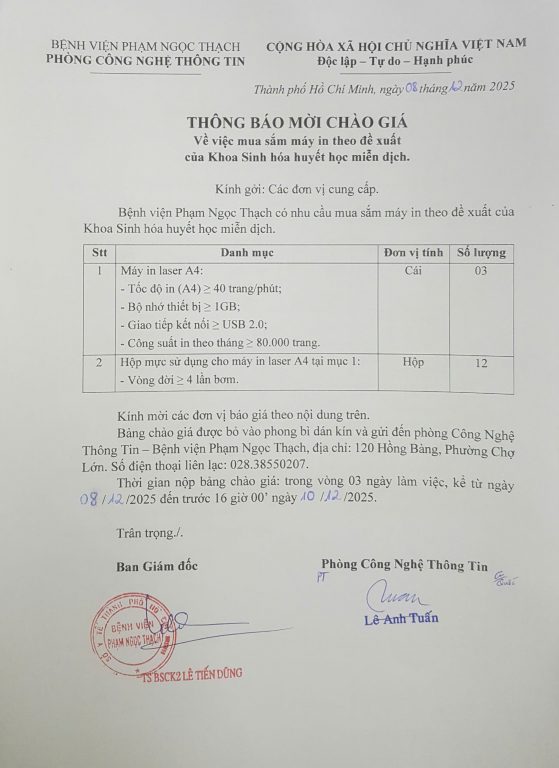 Thông báo chào giá về việc mua sắm máy in theo đề xuất của Khoa Sinh hóa huyết học miễn dịch (P.CNTT)