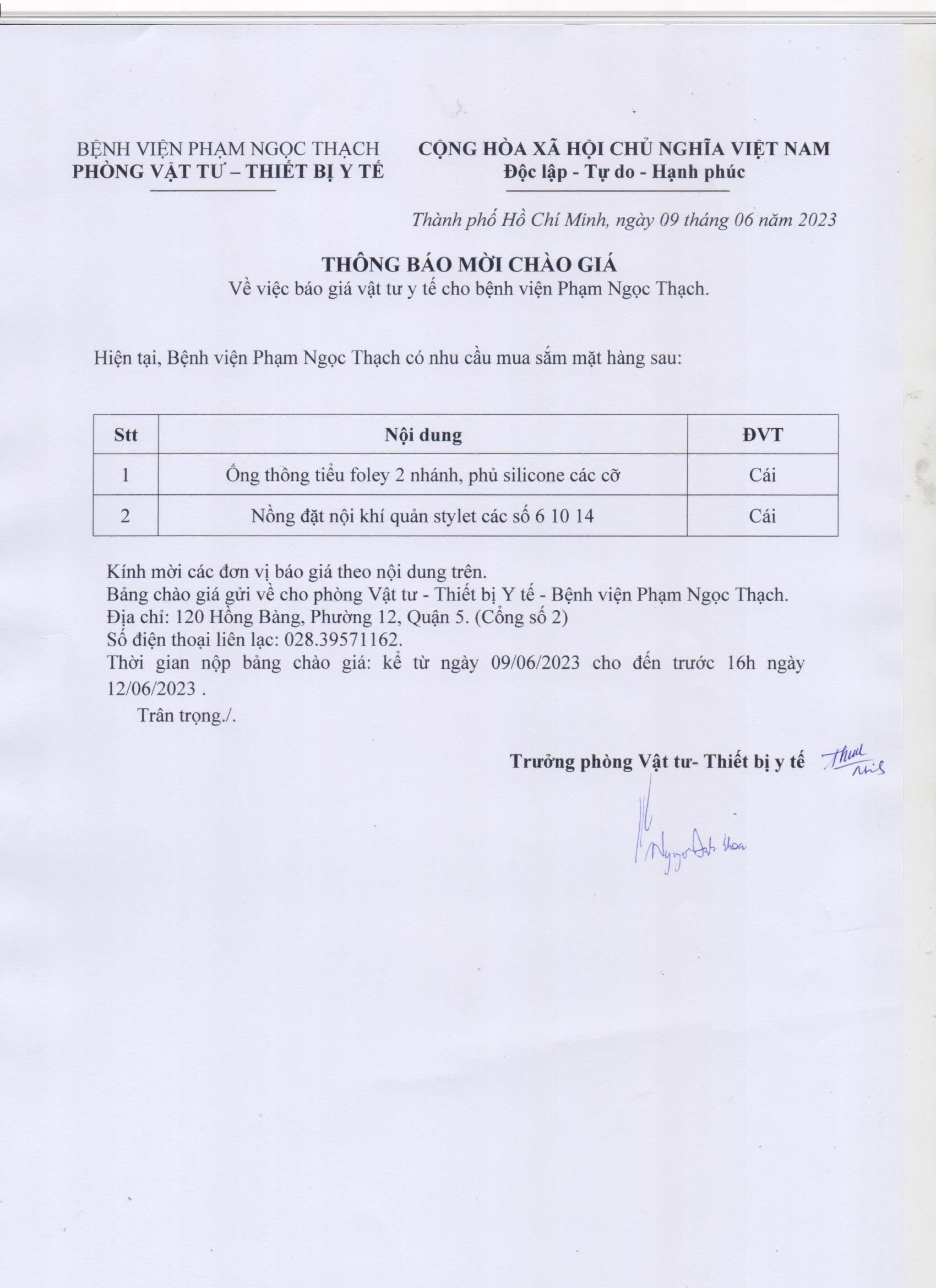 Thông báo mời chào giá về việc báo giá vật tư y tế cho bệnh viện Phạm Ngọc Thạch (P.VTTTB)