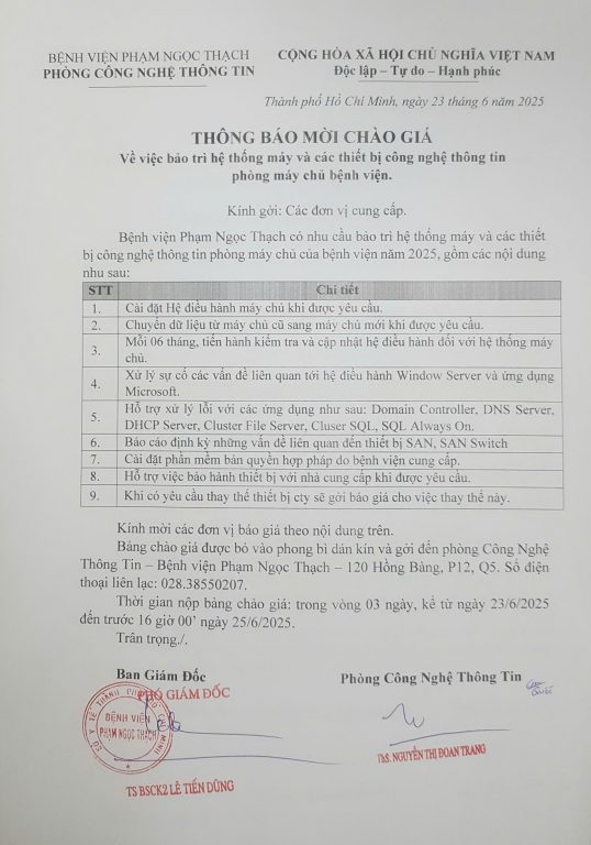 Thông báo mời chào giá về việc bảo trì hệ thống máy và các thiết bị công nghệ thông tin phòng máy chủ bệnh viện (P.CNTT).