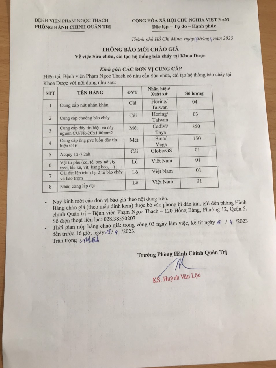 Thông báo mời chào giá về việc Sửa chữa, cải tạo hệ thống báo cháy tại Khoa Dược (P.HCQT)