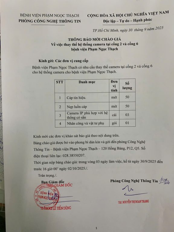 THÔNG BÁO MỜI CHÀO GIÁ Về việc sửa chữa và thay thế hệ thống camera tại cổng 2 và cổng 6 Bệnh viện Phạm Ngọc Thạch (P.CNTT)