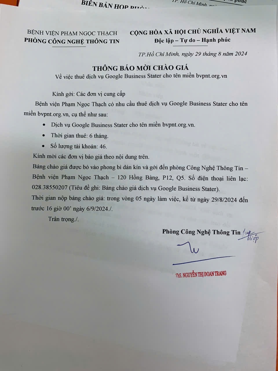 Thông báo mời chào giá về việc thuê dịch vụ Google Business Starter cho tên miền bvpnt.org.vn (P.CNTT).
